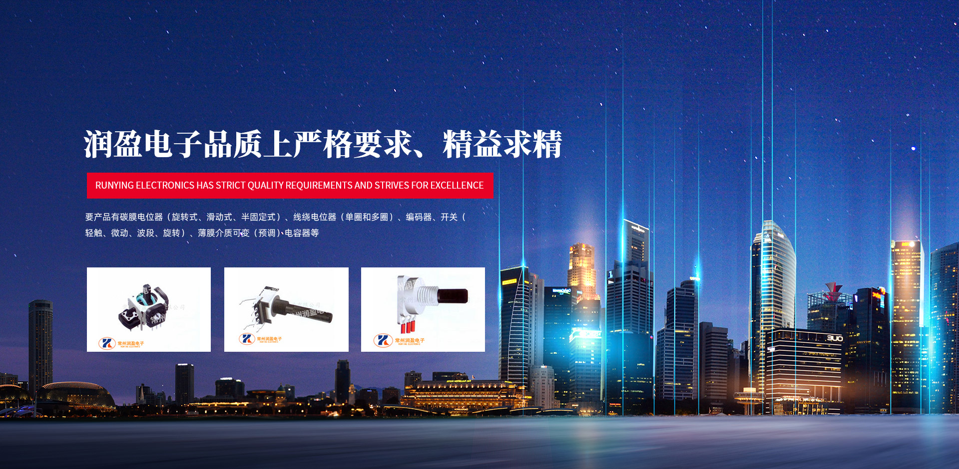 常州潤盈電子有限公司成立以來,從事編碼器、電位器、電子開關(guān)的研發(fā)和制造。公司總部設(shè)立在江蘇省常州市禮嘉鎮(zhèn)。常州潤盈電子有限公司擁有完整、科學(xué)的質(zhì)量管理體系,采用先進(jìn)的加工設(shè)備、精密的檢測儀器、高能的組裝生產(chǎn)線,在品質(zhì)上嚴(yán)格要求、精益求精,在團(tuán)隊(duì)管理上以人為本、精細(xì)管理,以此來確保本公司為客戶提供的優(yōu)良產(chǎn)品和服務(wù)。隨著公司業(yè)務(wù)的國際化,公司產(chǎn)品全部達(dá)到“ROHS”指令要求。公司現(xiàn)在主要產(chǎn)品有碳膜電位器(旋轉(zhuǎn)式、滑動(dòng)式、半固定式)、線繞電位器(單圈和多圈)、編碼器、開關(guān)(輕觸、微動(dòng)、波段、旋轉(zhuǎn))、薄膜介質(zhì)可變(預(yù)調(diào))電容器等。我們始終堅(jiān)持“效率成就品牌,誠心鑄就未來”的宗旨。不斷創(chuàng)新是企業(yè)得以生存的動(dòng)力,潤盈電子期待與您的合作!